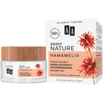 AA ENJOY NATURE укрепляющий дневной и ночной крем, снимающий покраснения 50 мл. AA ENJOY NATURE - это идеально подобранный натуральный уход, отвечающий потребностям вашей кожи! Опираясь на силу эффективных растительных экстрактов, мы создали уникальную гипоаллергенную формулу Успокаивающего крема «Усиление покраснений», который обеспечит куперозную кожу тем, в чем она больше всего нуждается: облегчением, восстановлением и интенсивной регенерацией. Делайте ставки на природу и наслаждайтесь красивой и здоровой кожей лица! Действие активных веществ: - Гамамелис & ndash; Экстракт гамамелиса комплексно ухаживает за кожей: стимулирует ее защитную функцию и уменьшает воспаление, укрепляет кровеносные сосуды, помогает уменьшить покраснение, имеет эффект против морщин. - Бисаболол & ndash; стимулирует восстановление и регенерацию эпидермиса, придавая коже здоровый вид - Аллантоин & ndash; успокаивает и восстанавливает кожу, делая ее мягкой и гладкой. Гипоаллергенный препарат, проверенный на аллергии. 99% ингредиентов натурального происхождения. Подходит для кожи с куперозои и раздраженной кожи.