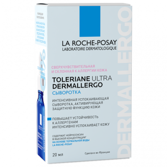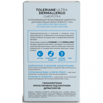Интенсивная успокаивабщая сыворотка Toleriane ULTRA Dermallergo для сверхчувствительной и склонной к аллергии кожи обладает двойным действием: активирует естественную защитную функцию кожи и заметно уменьшает признаки раздражения от воздействия внешних факторов, среди которых: пыльца, загрязненный воздух, моющие средства и др. Сверхчувствительная и склонная к аллергии кожа характеризуется ослабленным естественным барьером, который отвечает за защиту кожи от воздействия внешних факторов. ИННОВАЦИЯ 3 - Интенсивная сыворотка Toleriane Ultra Dermallergo обладает двойным действием: активирует естественную защитную функцию кожи и заметно уменьшает признаки раздражения от воздействия внешних факторов, среди которых: пыльца, загрязненный воздух, моющие средства и др. ПОКАЗАНИЯ К ПРИМЕНЕНИЮ: Сверхчувствительная и склонная к аллергии кожа лица и области вокруг глаз, склонная к раздражению, покраснениям, реакции на внешние факторы. Легкая, нелипкая текстура сыворотки мгновенно впитывается, обеспечивая длительное ощущение комфорта. Подходит в качестве основы под макияж. ГИПОАЛЛЕРГЕННАЯ ФОРМУЛА. БЕЗ ПАРАБЕНОВ, ОТДУШЕК, СПИРТА 2 , КРАСИТЕЛЕЙ. Протестировано под контролем дерматологов