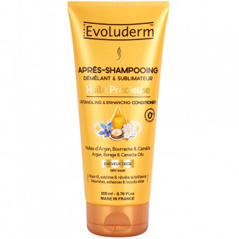Кондиционер не содержит силикона и специально разработан для сухих волос. Кондиционер для расчесывания и сублимации Precious Oil сочетает в себе три масла для восстановления жизненных сил и блеска волосяного волокна. Эта смесь действует против недостатка питания, масло бурачника разглаживает чешую, масло арганы защищает от внешних воздействий, а масло камелии делает волосы блестящими. Текстура бальзама, которая покрывает волосы с захватывающим ароматом с солнечными нотами.