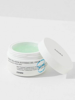 COSRX - Hydrium Green Tea Aqua Soothing Gel Cream - крем содержит экстракт листьев Aloe Ferox и листьев Camellia Sinensis, которые успокаивают раздраженную кожу с легким охлаждающим эффектом. Добавление пантенола и аллантоина улучшает гидратацию более глубоких слоев эпидермиса, что поддерживает процессы регенерации и реконструкции. Продукт обладает гелеобразной консистенцией, быстро впитывается, поэтому его можно использовать под макияж даже людям с жирной кожей, оставляя ощущение свежести на коже.