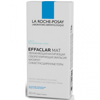 Жирный блеск и расширенные поры возникают вследствие избыточной выработки кожного сала (себума). Эмульсия Effaclar Mat содержит компонент Sebulyse, который уменьшает выработку себума, оказывая матирующее действие и способствуя сужению пор. Себорегулирующее действие Sebulyse превосходит по эффективности Цинк, признанный активный компонент. Эфаклар Мат подходит для чувствительной кожи. Протестировано под контролем дерматологов. Сразу после нанесения кожа становится матовой и увлажненной. День за днем состояние кожи улучшается: нормализуется выработка кожного сала, поры сужаются, уменьшается жирный блеск. Не содержит маслянистых компонентов. Оказывает длительный матирующий эффект. Некомедогенно.