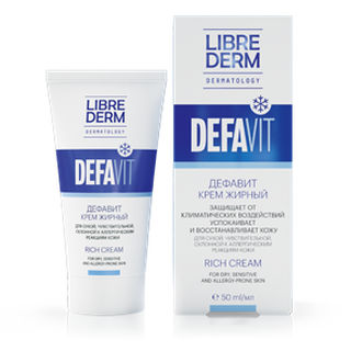 Крем жирный ДЕФАВИТ LIBREDERM – это универсальный cold крем для защиты чувствительной кожи зимой, содержащий необходимые для жизнеобеспечения и обновления кожи витамины: Д-пантенол, Е, F, A. Комплексное действие синергических компонентов крема дает быстрый результат: • устраняется сухость, покраснение, шелушение кожи • кожа надежно защищена от действия негативных факторов, • ощущение комфорта и увлажненности кожи в течение всего дня.