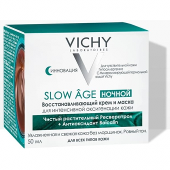 Так же как и Вам, Вашей коже нужен отдых от активного ритма жизни в городе. Благодаря оксигенирующей ночной крем-маске VICHY SLOW AGE Ваша кожа может по-настоящему «вдохнуть глоток свежего воздуха», чтобы восстановиться ночью. А другие продукты SLOW AGE поддержат Вас в течение загруженного рабочего дня благодаря натуральным ингредиентам и эффективным формулам. Впервые* в формуле объединены Ресвератрол, известный своей способностью насыщать клетки кислородом, и антиоксидант Baicalin, способствующий нейтрализации последствий процессов окисления в коже, которые происходят в течение дня из-за воздействия факторов внешней среды. Подходит для всех типов кожи, в том числе чувствительной. Гипоаллергенно. * среди продуктов VICHY.